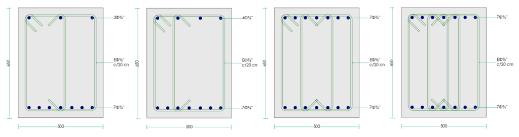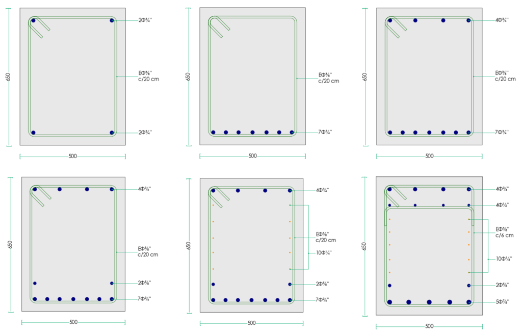 - Barras para el refuerzo longitudinal: según la sección, están disponibles diferentes capas de refuerzo, aplicables para refuerzo inferior, superior, segunda capa de refuerzo y refuerzo a torsión (naranja); a las que se les puede asignar distinta cantidad de barras y diámetro.