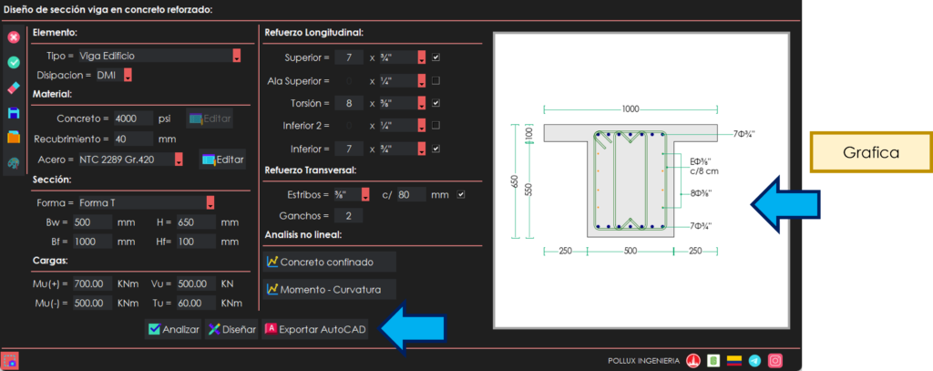 El programa permite una revisión integral del elemento, abarcando de forma clara y estructurada los estados límite de flexión, cortante y torsión, con resultados consistentes y bien fundamentados con la NSR-10. Destaco especialmente la forma en que maneja el detalle de las secciones transversales, ya que el dibujo automático facilita enormemente la comprensión del refuerzo y reduce errores típicos de interpretación.