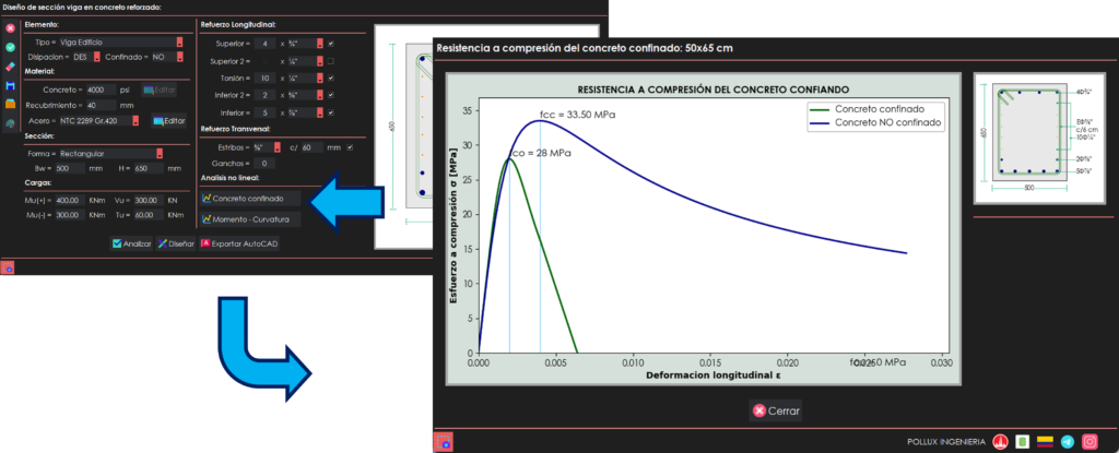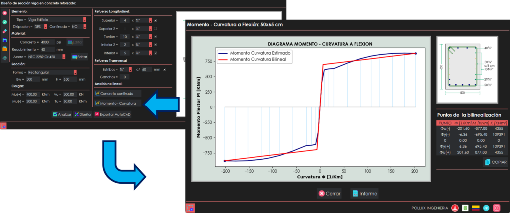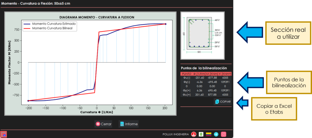 Para los informes recomendamos tomar un pantallazo de esta ventana, en la que se puede observar la sección utilizada, los resultados de la curva momento curvatura, y su binealización, y los datos numéricos listos para copiar.