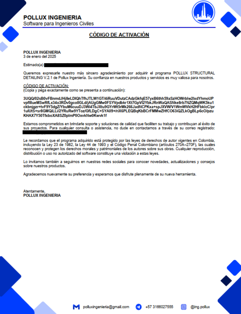 6. Verificaremos el pago asociado al código de solicitud y, una vez confirmado, le enviaremos un documento PDF denominado POLLUX – CÓDIGO DE ACTIVACIÓN, lo antes posible.