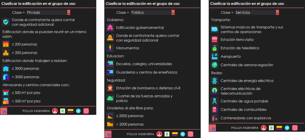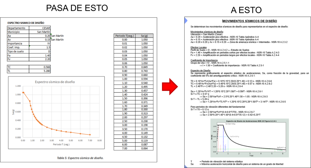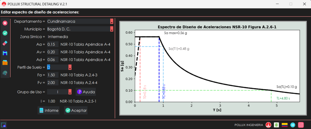 Utilizar el espectro de diseño de Pollux Structural Detailing es muy fácil. Solo debes ingresar el departamento, el municipio, el perfil del suelo y el grupo de uso. Automáticamente, el espectro de diseño de aceleraciones se actualiza.